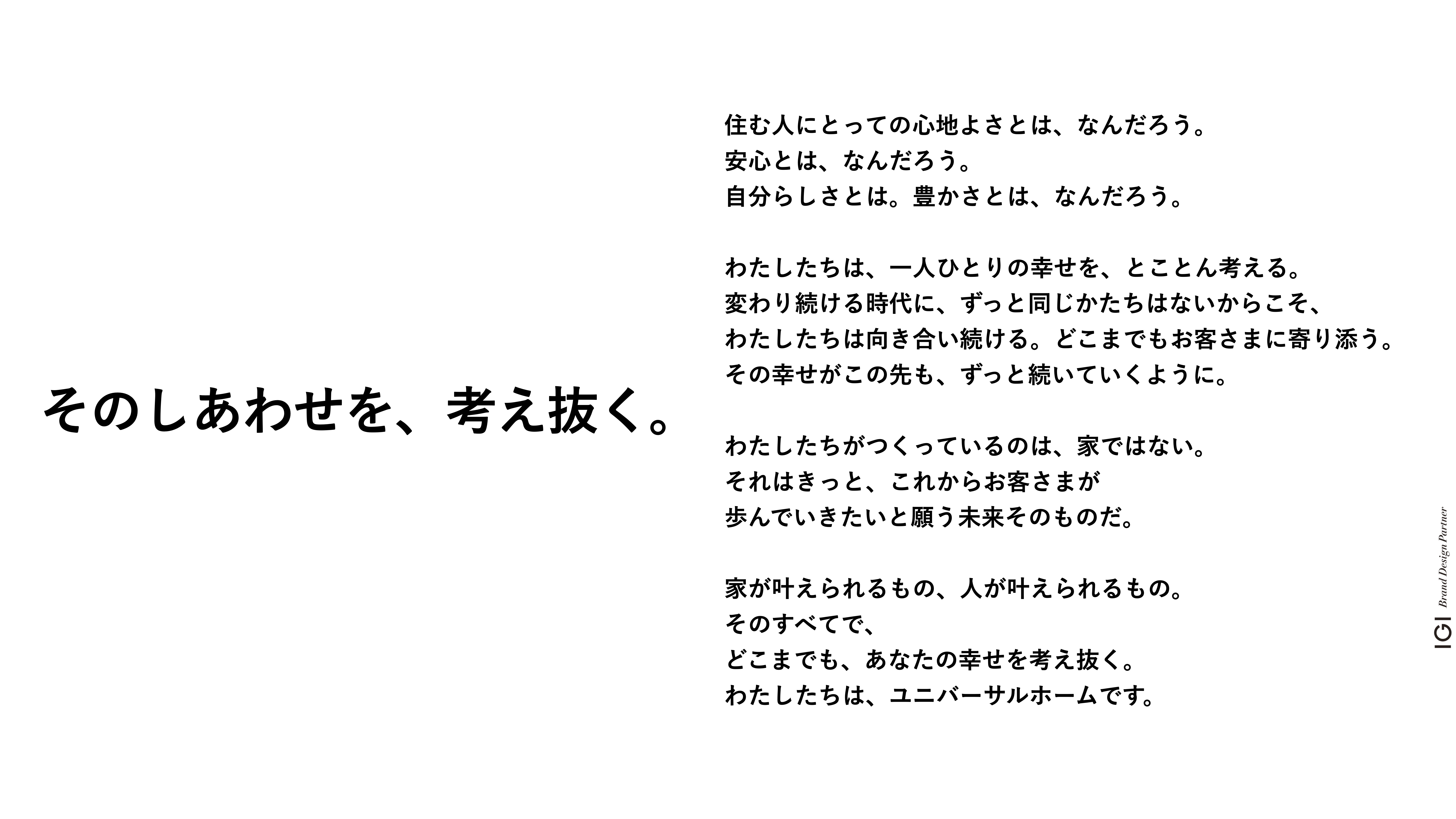 これを期に実施したリブランディングプロジェクトでは、ブランドの方向性から営業のあり方までを見直し、IGIが伴走しながら何度も対話を重ねてたどり着いたメッセージです。そこには、企業として大切にしたい姿勢と、未来への指針が込められています。
