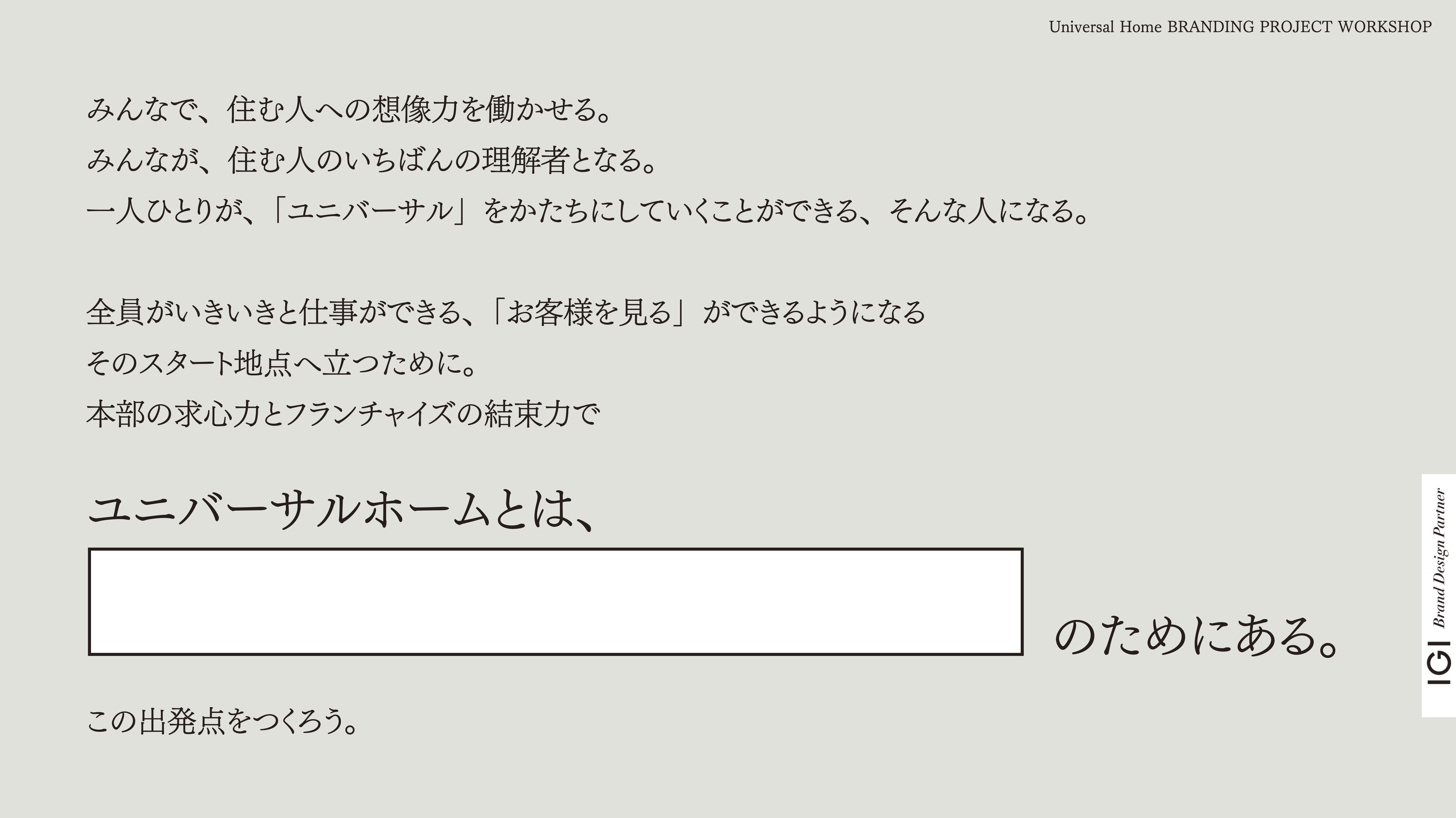 内藤:学びというよりは、自分自身も挑戦させてもらった感覚があります。それくらい思い入れの強いプロジェクトでした。ユニバーサルホームさんのブランドブックを作るときも、最初は「IGIメンバー総出で行こう」という話になるほど、IGI内のメンバーの熱量も高かった。そんな方々とご一緒できたことは、自分にとって大きな経験でした。そして何より、あのときのフィードバックの量と熱量が強く印象に残っています。「本気で会社を良くしたい」という気持ちを肌で感じ、自分もその熱量を伝えていく存在でいなければ、と。今もその経験が、ブランディング案件に向き合うときの判断軸になっています。